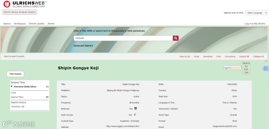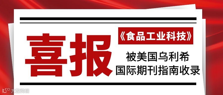 近期,《食品工业科技》被美国乌利希国际期刊指南收录,标志着期刊的学术质量、期刊国际化、标准化和规范性等方面得到了充分认可和肯定,对进一步提升期刊学术水平和扩大期刊国际影响力与核心竞争力具有重要意义。