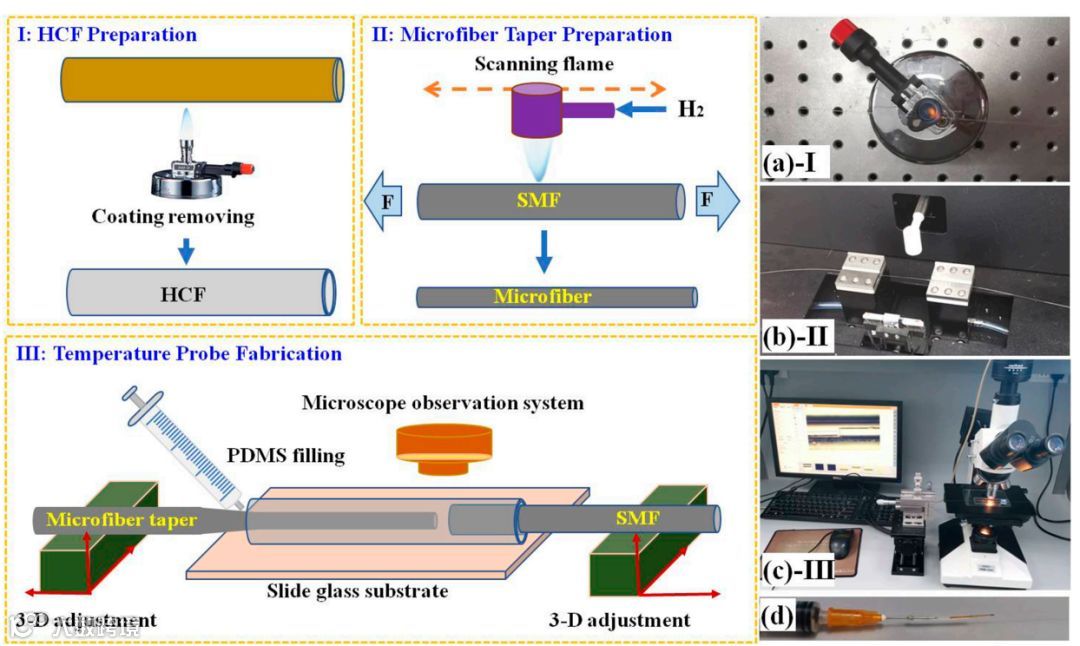 近日,东北大学李晋等人采用聚二甲基硅氧烷(PDMS)将微光纤封装在一根空心(HCF)内,设计了一种微型法布里-珀罗温度探头。微光纤端部和普通单模光纤端头作为法布里-珀罗干涉仪的反射面。实验结果表明,该传感器的灵敏度为11.86 nm/ ℃,并且在43到50 ℃温度范围内线性效应非常好。这种高灵敏度依赖于PDMS具有较大的热膨胀系数。由于PDMS物理化学特性,该温度传感器的工作温度不能超过200 ℃。然而由于其低成本、快速的制造工艺、紧凑的结构和低于10-4 ℃的温度分辨率等优点,使其在探测具有超高温度灵敏度和精度等领域具有很大的应用前景。