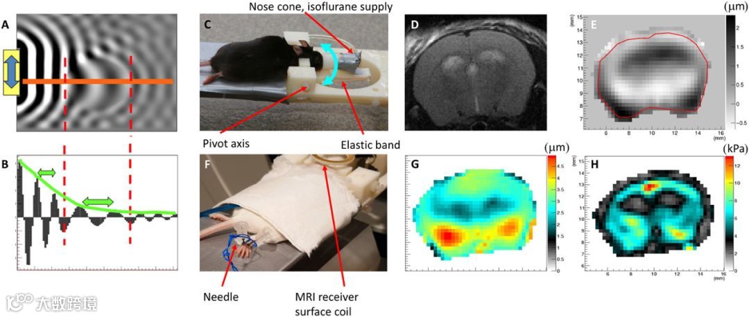 (a)剪切波位移场二维数值模拟。(b):(a)中沿橙色线的位移图,显示了刚性椭球中波长的增加和介质摩擦力导致的波衰减。(c)适应鼠头部摇动式MRE系统。青色双箭头指示可移动前部的旋转方向。(d)t2加权的解剖图像。(e)在一个时间点通过切片方向测量的位移场。(f)在后肢放置电刺激针。(g)总诱发位移幅度(μm)。(h)重建过程后产生的复数剪切模量中实部的剪切模量。