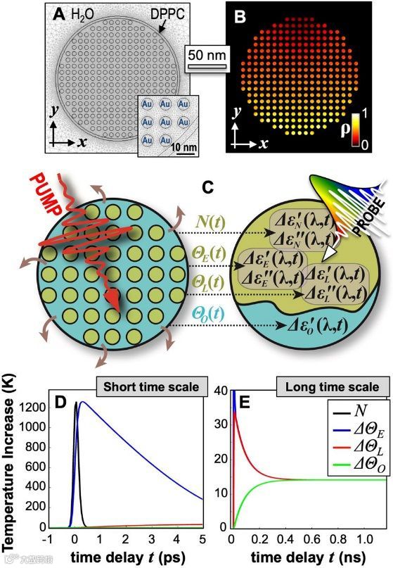 (a)用于二维数值模拟的几何网格结构。插图显示了网格的放大,以突出显示单个AU区域。(b)在400 nm波长下吸收泵脉冲后的模拟功率密度。(c)由金属纳米晶(绿色)和有机基质(青色)制成的两相制剂示意图,以及用于模拟泵-探针实验的基本原理,四个动态变量中的每一个都对两相的介电常数产生单独的贡献。(d和e)在(d)短时间标度和(e)长时间标度上不同动态变量的温度-时间曲线。