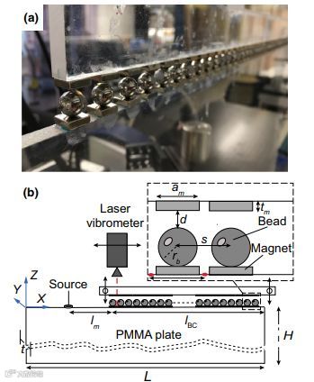 近日,来自加州理工学院的Antonio Palermo提出并演示了一种表面声波操作策略, 该策略涉及通过外部磁场控制的基于接触的铁磁谐振器。其桌面实验设置包括一个薄板, 作为一个二维模型, 配备了一系列铁磁谐振器在板的边缘。紧凑型设置用于实验测量板边缘波的调谐, 其色散特性类似于半无限介质中的表面声波。通过改变第二个永磁阵列的位置来调整铁磁珠的共振, 从而改变杂化带隙发生的频率范围,该谐振器与薄的永磁体接触, 并位于弹性板的自由边缘。另一组磁体, 放置在控制珠子和改变距离, 用来改变接触刚度和固有频率的谐振器上。利用谐振来通过边缘波杂化来打开大频带间隙, 并实施调谐策略来改变它们的频率范围,通过数值模型预测了杂化边缘波的调谐色散特性, 并通过激光振动测量对其进行了实验重建, 得到了很好的一致性。利用磁相互作用和接触力学作为表面声波系统的调谐策略, 可以为传感和电子元件的可编程器件铺平道路。虽然我们使用这个平台来演示带隙的移动, 但同样的方法可以无缝地扩展到其他波的操作效果, 比如亚波长波导或透镜成像。相关文章发表在杂志《Physical Review Applied》上。