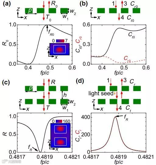 (b) 双层介质光栅的结果。在共振频率fR处的波转换效率(405),远大于单层光栅的结果(0.55)。这个现象,起源于BIC结构对内部传播波(即橙色小箭头)的放大效应。