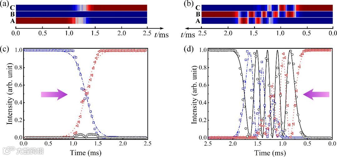 图二: 单向声局域绝热过程实验验证。(a) A腔体激励条件下,归一化声强演化过程。(b) C腔体激励条件下,归一化声强演化过程。(c) A腔体激励条件下,各腔体在不同时刻的测量(理论)声强。(d) C腔体激励条件下,各腔体在不同时刻的测量(理论)声强。其中,蓝色方块(蓝色点划线)、黑色圆圈(黑色实线)和红色三角形(红色虚线)分别表示腔体A、B和C中测量(理论)数据。