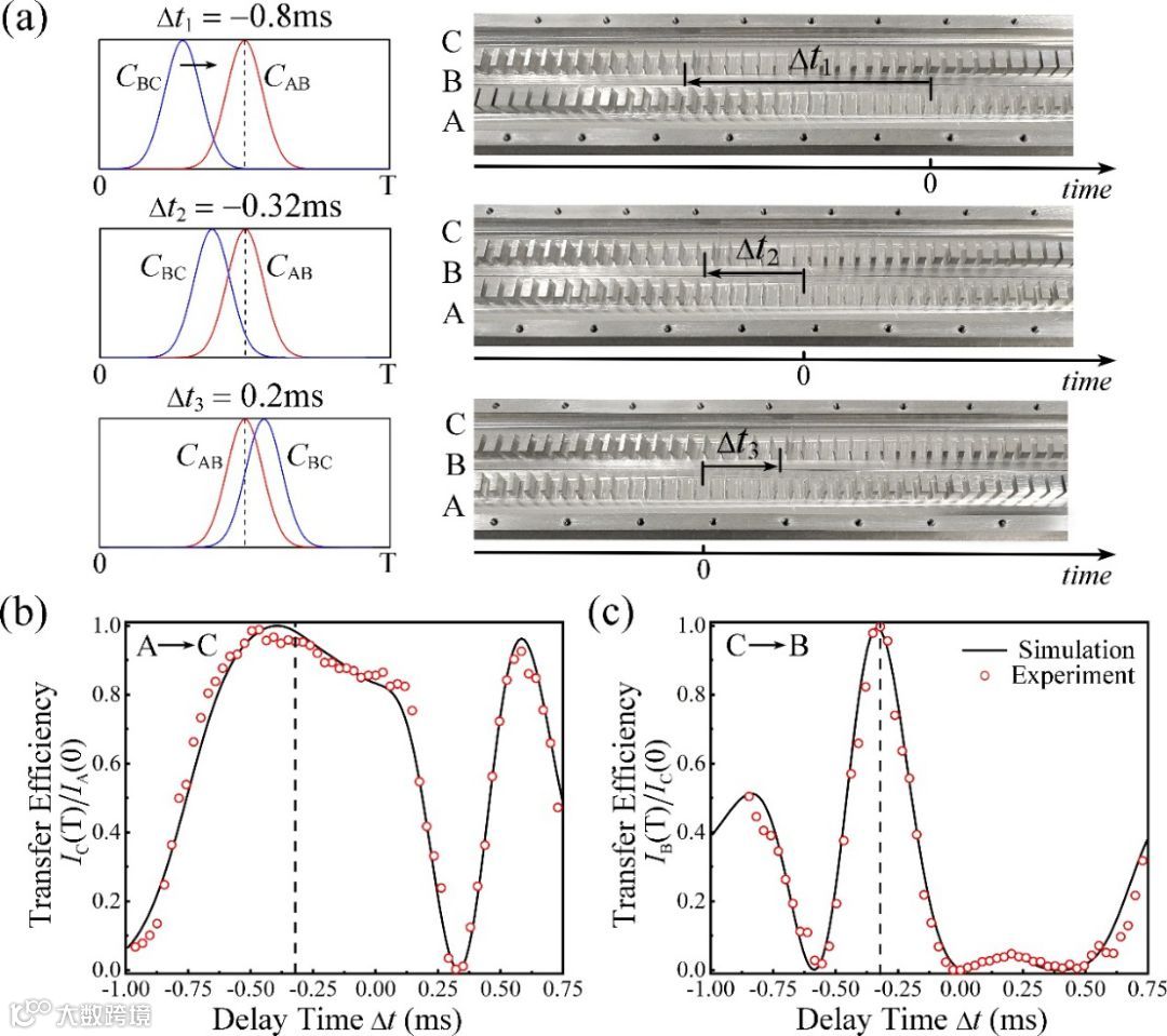 图三: (a) 相邻腔体之间耦合作用在不同延迟时间下对应的实验样品结构。(b) 声波从A腔体到C腔体的转化效率与耦合作用延迟时间之间关系。(c) 声波从C腔体到B腔体的转化效率与耦合作用延迟时间之间关系。