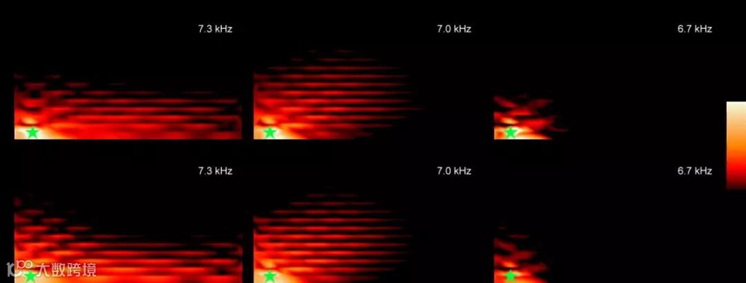 图3 均匀声赝磁场诱导的边界态(见7.3 kHz),五角星标记声源位置