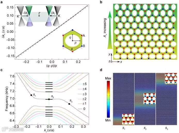 (见图1c)。这种源于线性能带的相对论性朗道能级结构非常独特,它和通常源于抛物型能带的等间距朗道能级显著不同。值得关注的是,这里每个朗道平台对应于高度简并的、波包中心位置不同的体态。随着波包中心靠近样品边缘,声回旋轨道变得开放、频率逐渐偏离于朗道能级,态变得越来越局域于样品边界(见图1d中 s1和s3态)。作为相对论性体系的一个重要特点,图1d中(s2)也显示了零朗道能级的子晶格极化现象。