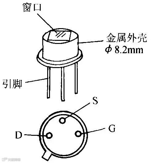 普通热释电人体红外线传感器的外形如图所示,D脚和S脚分别为内部场效应管的漏极和源极的引出端,G脚为内部敏感元件的接地引出端。因S和G之间悬空,故使用时其间应接输出电阻R,才能输出传感信号。为了增强抗干扰能力,在此电阻上应并一个电容C。传感器由敏感单元、滤光窗和菲涅尔透镜组成。