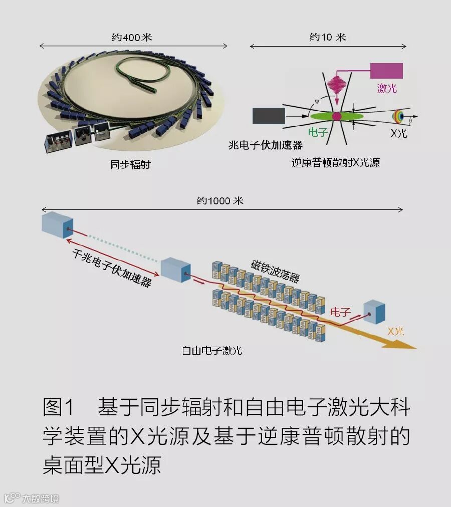 同步辐射和自由电子激光是目前最先进的X光源,这两类大科学装置均利用高能电子束在磁铁波荡器中产生高通量的X光,装置尺寸都在数百米至数千米(如于2018年4月正式启动建设的上海硬X射线自由电子激光装置,长约3千米,总投资约95亿元人民币)。同步辐射装置采用环形布局,X光沿电子圆周轨道切线方向引出,同一个电子束产生的X光可同时供数十个束线站使用;自由电子激光装置采用直线布局,一般同一个电子束产生的X光难以同时供多个束线站使用。这两类大科学装置不仅占地规模大、投资金额高,技术复杂度也极高,一般需要倾全国之力才能建成这样的公共科研平台。