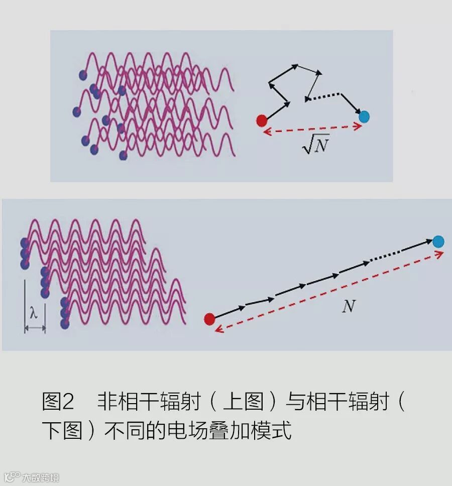 目前逆康普顿散射X光源的光子产额虽然偏低,但是却有着很大的提升空间。分析表明,对于包含N个电子的电子束,其总的辐射场可表示为单个电子辐射场的矢量叠加,而整个电子束团的辐射功率为电场模的平方。对于波长远小于电子束长度的非相干辐射,由于各电子产生的辐射场不存在固定的相位关系,对各电场的求和类似于随机行走(见图2上),N步以后距离原点的距离正比于N1/2,对应的辐射功率正比于N;而对于间隔为辐射波长的微束团产生的相干辐射,类似于每步都沿相同方向前进(见图2下),N步以后距离原点的距离正比于N,对应的辐射功率正比于N2。由于N一般为很大的数(比如0.16 纳库电子束对应的电子个数为N=109),因此相干辐射相比非相干辐射在辐射功率上会有量级的提升,这也是自由电子激光比同步辐射亮度高数个量级的原因。
