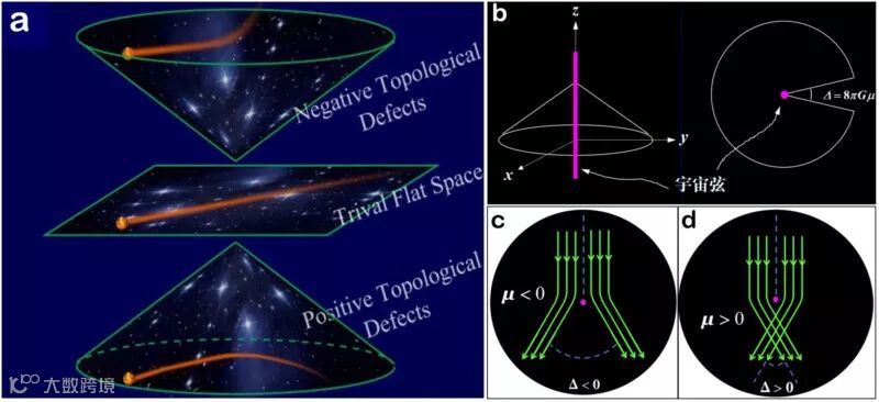图一 (a)宇宙弦拓扑时空的嵌入图; (b) 宇宙弦拓扑时空的角度缺损; (c)负质量宇宙弦对光线的排斥;(d)正质量宇宙弦对光线的吸引。