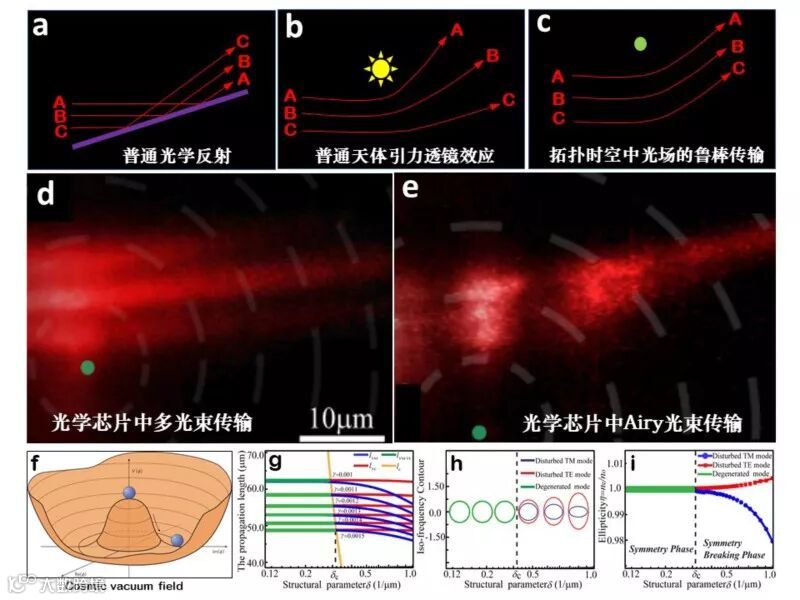图三(a)普通光学反射; (b)普通天体的引力透镜效应; (c) 拓扑时空中光场的传输; (d) 光学芯片中多光束传输实验; (e) 光学芯片中Airy光束传输实验; (f)宇宙真空场的自发对称性破缺; (g)调节材料损耗模拟拓扑相变; 相变过程中超材料光学模式的改变(h)与对称性破缺(i)。