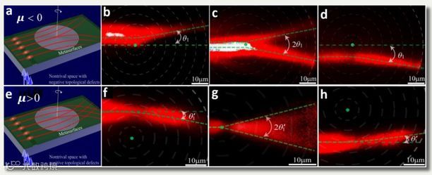 图二 二维弯曲超材料模拟负质量宇宙弦(a)和正质量宇宙弦(e); 负质量宇宙弦排斥光束的实验结果(b-d); 正质量宇宙弦吸引光束的实验结果(f-h).
