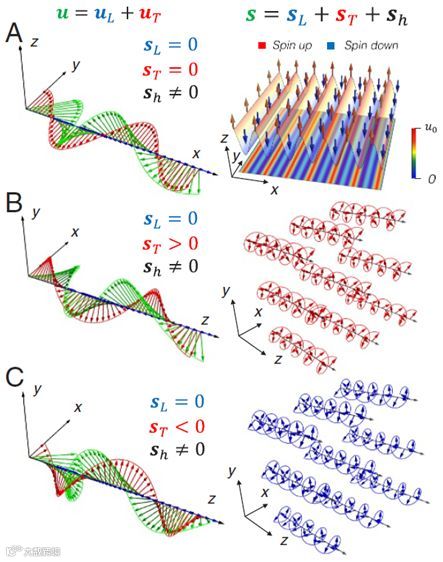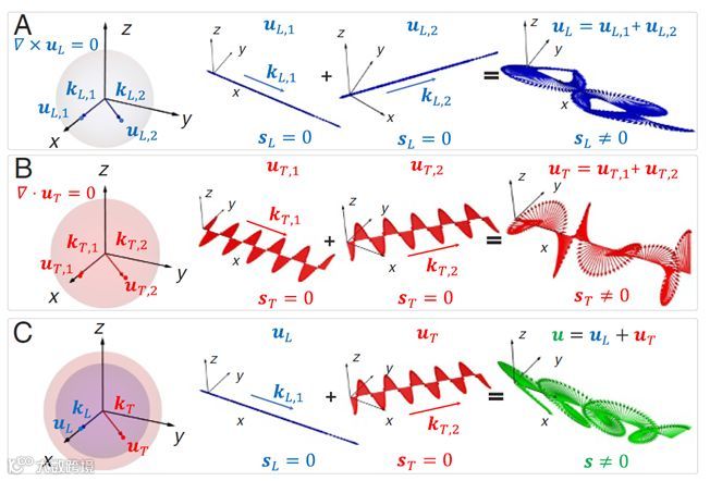 (A)当两种不同类型的弹性波:纵波和横波,沿着同一方向传播时,他们的总场会拥有非零的自旋角动量分布,这个自旋角动量源于自旋的杂化;