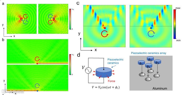(d)利用嵌入在弹性介质(比如,铝)表面的具有一定相位差的压电陶瓷片,可以实现不同圆极化的弹性波点源。