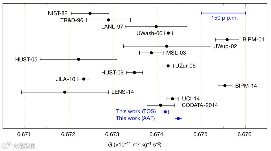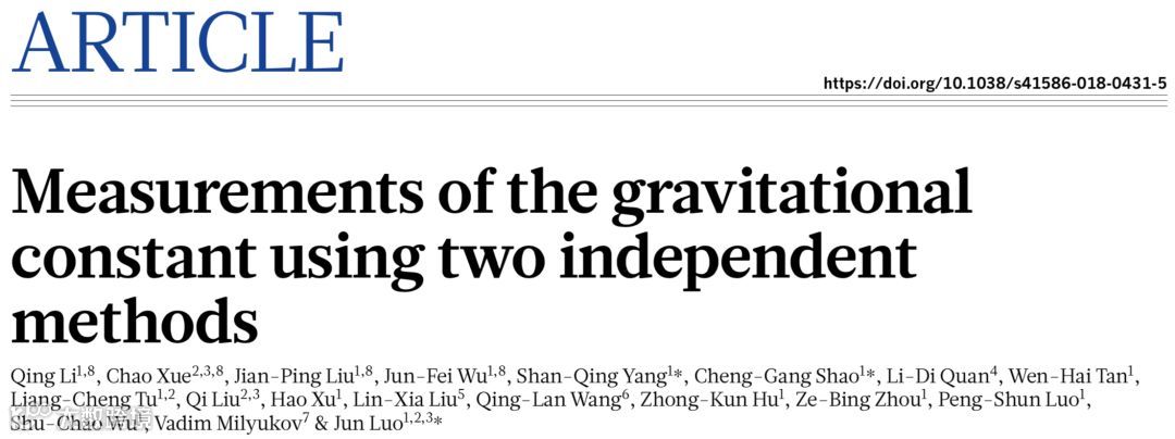 在最新一期的Nature正刊中,来自武汉华中科技大学的罗俊教授课题组采用扭秤周期法和扭秤角加速度补偿法,测定出更为精确的G值,分别为:6.674184 × 10−11和 6.674484 × 10−11m3· kg-1 ·s-2;误差值在百万分之11.64,11.61。这一数值是目前所知最小误差值。