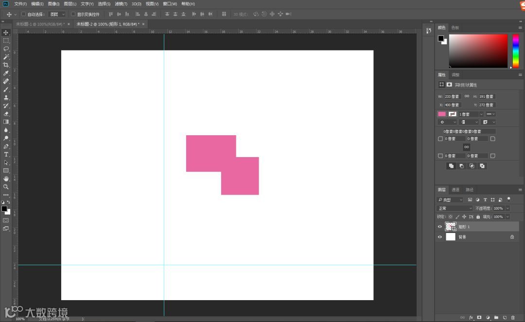如上图所示,画完一个矩形之后,按住【shift】键,原先指示光标的右下角会出现一个小加号,这时候在原先矩形图案上再画一个矩形,两个图案就会变成一体的。