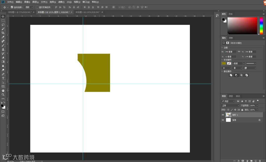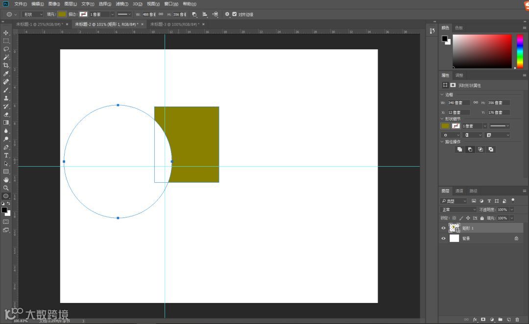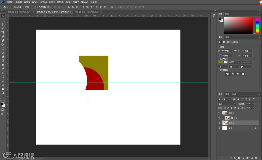 例如上图,当我们绘制了一个矩形之后,按住【Alt】键,指示光标右下角会出现一个减号,这时候再绘制一个圆形,那么圆形与矩形重合的部分将被“减掉”。