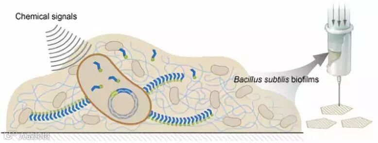 图1. 可编程可打印的枯草芽孢杆菌生物被膜活体材料示意图。