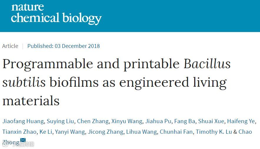 2018年12月3日,钟超课题组在前期的基础之上近日在Nature Chemical Biology上在线发表了题为Programmable and printable Bacillus subtilis biofilms as engineered living materials的论文,在开发可编程可3D打印细菌生物被膜活体功能材料方面取得重要进展。