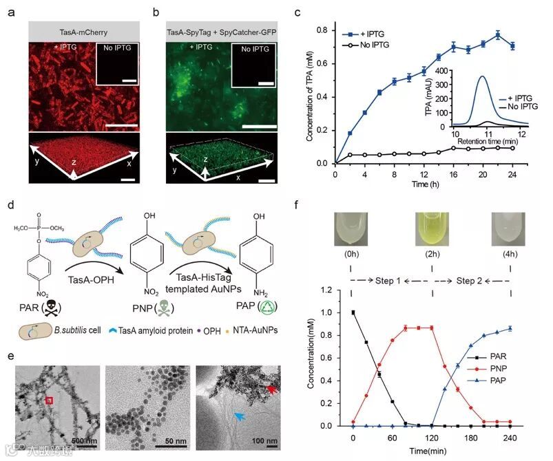 具体来说,表达了TasA-OPH的生物被膜(有机磷水解酶,OPH)可以降解农药对氧磷(PAR)将其转变为危害较小的中间产物对硝基苯酚(PNP),接着通过锚定在生物被膜上面的金纳米颗粒(AuNPs)可以进一步催化PNP并将其降解为低毒害的对氨基苯酚(PAP)。这种活体细胞/无机杂化催化体系的建立为活体功能材料在生物修复、人工光合等方面的应用提供了很好的示范作用。