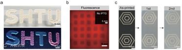 此外,研究人员还发现,利用基因工程不仅能改变枯草芽孢杆菌生物被膜的成份及生化功能,还能通过改变这些成份进一步调节生物被膜本身的机械性能(比如粘弹性)和物化性质(比如亲疏水性)。被改造后的生物被膜展现出更适宜生物制造的凝胶胶体性质,可以通过3D打印精确地制成不同的三维形状。另外,实验证明这些活体材料不仅本身可以直接3D打印也可以与量子点混合打印(图4a),并且打印成型的活体材料在水凝胶中能感应溶液中的外界信号发出荧光(图4b),因此可以作为生物传感器来应用(图4c)。