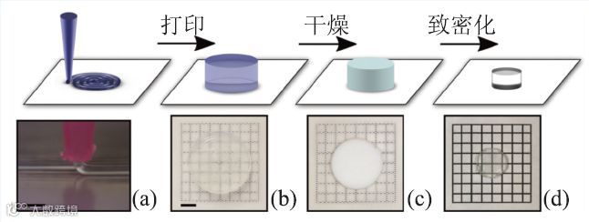 DIW 使用的耗材为适合于挤出的陶瓷膏体,多用于羟基磷灰石、磷酸钙、生物玻璃等生物陶瓷的组织工程支架制造。将经过亲水处理的纳米石英粉末、四乙二醇二甲醚和PDMS混合制得适合打印的陶瓷墨水,通过DIW 打印、干燥和烧结后,可制造出高透明度的石英玻璃(图6)。