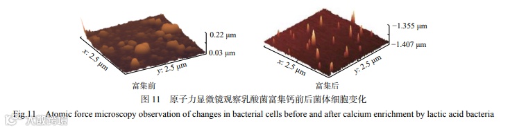 原子力显微镜(AFM)可以在接近生理条件的溶剂体系中直接观测生物分子的表面特征,可用于表征不同软度的生物样品甚至活体细胞,并且具有样品处理简单、图像重复性强、力学灵敏度高和空间分辨率高的优势,是研究生物学的有力工具。以植物乳杆菌CY1-1为观察对象,观察乳酸菌富集钙前后菌体细胞变化。图11显示的是植物乳杆菌富集钙前后原子力显微镜微观结构的影响,在三维形貌图中,较暗的区域为表面较低的部分,较亮的区域为表面较高的部分,可以看出,乳酸菌富集钙后的颜色差异较大,细胞表面高度差较大;正常乳酸菌表面凸起形状平坦圆滑,富集后的凸起形状尖锐,说明乳酸菌在与钙结合后聚集颗粒大且多。综上所述,乳酸菌富集钙离子后,菌体表面聚集了大量钙离子,致使细胞形态与正常菌株差异较大。