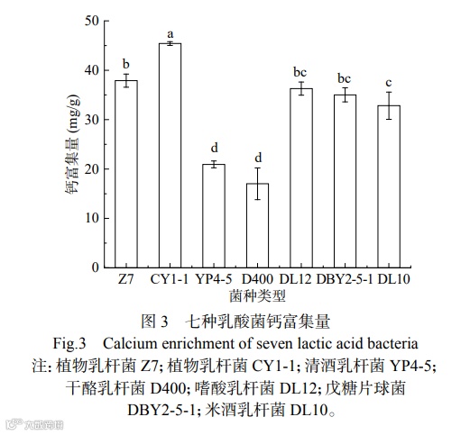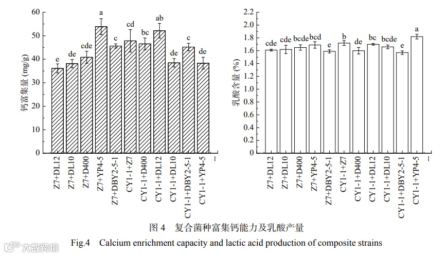 将七种乳酸菌在钙离子浓度为1.2 mg/mL的氯化钙溶液中进行培养,以溶液中钙离子浓度差与乳酸菌浓度之比显示为钙富集的差异。从图3可以看出,各菌株对钙的富集有明显差异,钙富集量在17.01 到45.41 mg/g间不等,之前亦有实验表明,乳酸菌对金属离子的富集有差异。七种乳酸菌中钙富集量最高的是植物乳杆菌CY1-1,其钙富集量为45.41 mg/g,其次为植物乳杆菌Z7,钙富集量为37.9 mg/g。为探讨乳酸菌复合发酵对钙富集能力的影响,选取以上两种乳酸菌与其余五株菌进行复合,研究复合菌株的钙富集能力。