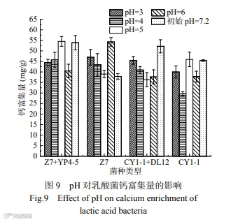 pH是影响生物吸附金属离子的重要因素之一,在较低的pH下,由于氢离子竞争结合位点,导致乳酸菌与其他离子的结合数量下降。随着pH的升高,细胞表面官能团的负电荷增加,从而有利于离子与乳酸菌的结合。如图9所示,Z7和CY1-1+DL12组中,pH在3~5范围内的趋势是pH越小,钙富集量越多,这可能是由于酸性条件下有利于钙离子的溶出,使钙离子更多的暴露在溶液中与乳酸菌进行富集。从四组菌株整体看,最优富集量出现在pH为5、6和初始的pH(7.2),这是因为植物乳杆菌的最适pH在6.2~6.6的范围内。从图中可以看出,Z7的最适pH为6,CY1-1+DL12组的最适pH为7.2,Z7+YP4-5和CY1-1组在pH为5和7.2相差不多。