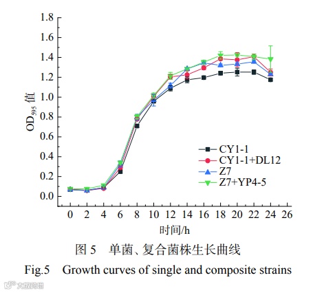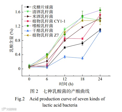 产酸能力是衡量乳酸菌品质的重要指标,优良的乳酸菌应兼具有良好的生长能力与产酸能力,从而提高发酵的产品风味与营养价值。本研究对七种乳酸菌的产酸能力进行测定,结果如图2。根据图2可知,随着培养时间的延长,各乳酸菌产酸量逐渐上升,培养24 h后七种乳酸菌产酸量由大到小依次为:嗜酸乳杆菌DL12>植物乳杆菌CY1-1>米酒乳杆菌DL10>清酒乳杆菌YP4-5>植物乳杆菌Z7>戊糖片球菌DBY2-5-1>干酪乳杆菌D400。乳酸菌的产酸速率与生长速率具有一致性,嗜酸乳杆菌具有较强的产酸和耐酸能力,产酸量较高;戊糖片球菌及干酪乳杆菌的生长情况滞后于其余菌株,产酸能力亦稍低于其余菌株。