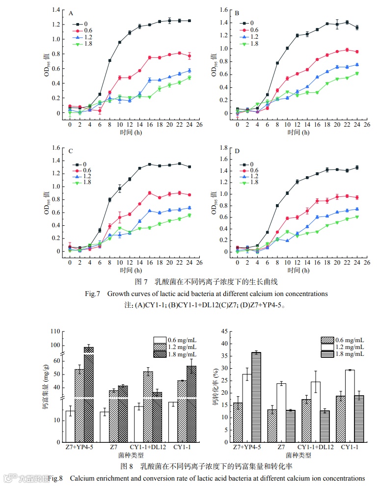 将四组乳酸菌分别接种在钙离子浓度为0、0.6、1.2、1.8 mg/mL的培养基中,对四种乳酸菌的生长曲线进行测定。从图7可以看出,各菌株随着钙离子浓度的升高,乳酸菌的生长能力均有所降低。这可能是由于培养基中成分比较复杂,含有K+、Na+、Mg2+等金属离子,而高浓度钙离子的存在,阻碍乳酸菌与其他金属阳离子结合,导致生长能力下降。另外高浓度的金属离子可能对菌体产生毒害或抑制作用,从而使生长量降低。根据图8可知,随着钙离子浓度的升高,钙富集量有所提升。这是因为在氯化钙溶液中进行富集,溶液中仅有一种金属阳离子——钙离子,不存在其他金属离子竞争,菌体的基团结合位点基本上都被钙离子占据,所以富集量较高。植物乳杆菌CY1-1+嗜酸乳杆菌DL12组富集量在钙离子含量为1.8 mg/mL时低于1.2 mg/mL组,这可能是由于钙离子浓度过高,抑制了该复合菌株的离子富集,导致富集量降低。根据钙转化率来看,只有植物乳杆菌Z7+清酒乳杆菌YP4-5组合的转化率和钙离子浓度成正比,这可能是菌株复合后吸附钙离子能力提高,没有因为浓度增大而出现富集量的降低,且该组的钙富集量远高于其余组合,故转化率有所提升。其余三组钙转化率最高的均为钙离子含量为1.2 mg/mL组。结合乳酸菌生长趋势、钙富集量、钙转化率得出,适合乳酸菌富集的钙离子浓度为1.2 mg/mL。