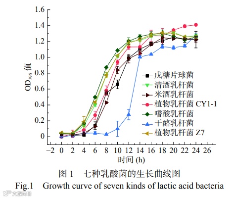 图1为七种乳酸菌的生长曲线。由图可以看出,七种乳酸菌的生长趋势大致相同,均呈先上升后平缓的趋势。在对数生长期(4~12 h)生长情况较好的是嗜酸乳杆菌,干酪乳杆菌的生长情况滞后于其余乳酸菌。进入稳定期后各乳酸菌的差异逐渐缩小,此阶段生长情况最好的是植物乳杆菌CY1-1,这可能是由于植物乳杆菌具有广泛性、普遍性,生长稳定,干酪乳杆菌生长情况较其余菌株差。