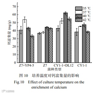 乳酸菌最适发酵产酸温度是40~42 ℃,而最适生长温度是35~37 ℃。实验选择35、37、40、42 ℃培养实验菌株,在钙离子含量为1.2 mg/mL中的氯化钙溶液中进行富集,比较富集钙效果。从图10可以看出,温度对于各组间钙富集量的影响具有一定差异,四组乳酸菌总体趋势为随着温度升高钙富集量呈先上升后下降趋势。其中Z7+YP4-5组的最适温度为37 ℃,其余三组的最适温度为40 ℃。Mrvčic等研究温度对于乳酸菌富集锌的影响,结果显示乳酸菌富集锌的能力随着温度的升高而提高,原因可能是温度影响了菌体的活性或乳酸菌与金属结合物的稳定性。