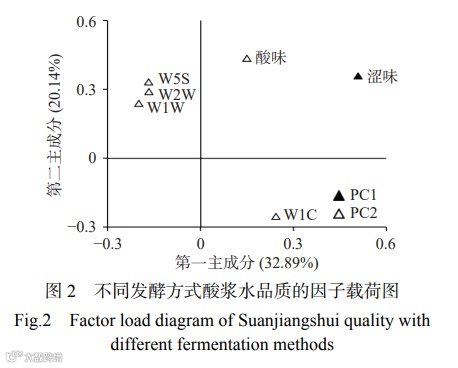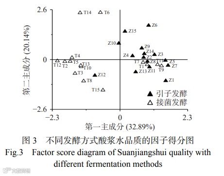 由图2可知,影响接菌和引子发酵浆水整体品质的关键感官指标为涩味、酸味、W5S、W2W、W1W和W1C。涩味在PC1中的系数为0.49,PC2中载荷最高的正影响指标为酸味,其载荷量为0.40,而在PC2中载荷最高的负影响指标为W1C(对芳香类物质灵敏),其载荷量为0.26。即PC1的主要差异集中在涩味,而PC2的主要差异则集中在酸味和W1C。基于PC1和PC2不同发酵方式酸浆水品质的因子得分图见图3。