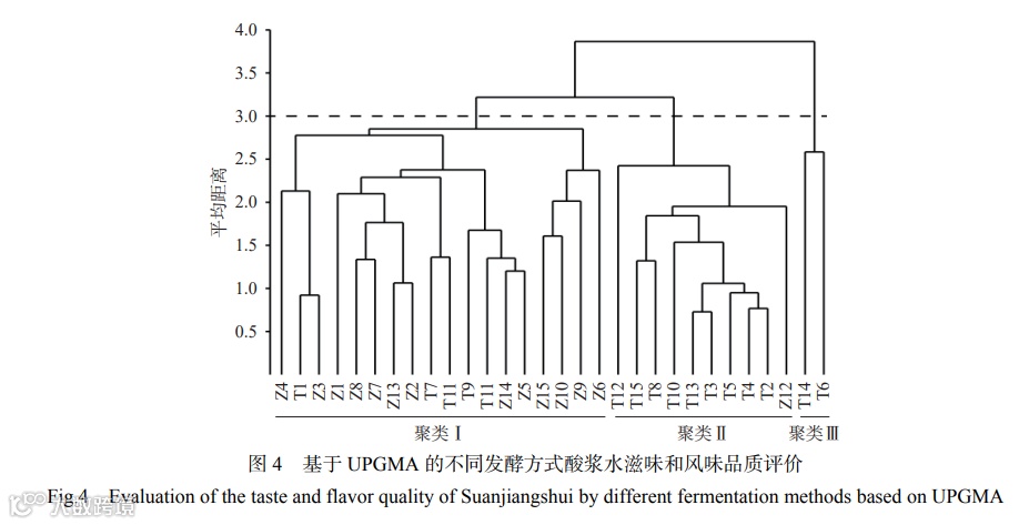 由图3可知,基于感官特征接菌发酵与加引子发酵浆水样品具有明显的分离趋势,引子发酵酸浆水样本主要集中在X轴正轴方向,发酵乳杆菌接菌发酵样品大多分布在第二、三象限,部分样品在横纵坐标上均较为分散。此外,引子发酵酸浆水Z12与接菌发酵样本较为接近,而接菌发酵酸浆水T1、T7、T9和T11与引子发酵样品聚在一起,究其原因,引子来源于不同家庭手工制作酸浆水其微生物组成及品质不完全相同,因此15个样本并未完全重叠,而15株发酵乳杆菌来源于对应的15个引子,引子和菌株发酵酸浆水部分样本品质会较为相近。引子发酵与接菌发酵对应编号样本间亦存在差异。结合因子载荷图,与接菌发酵浆水相比,引子发酵酸浆酸涩味较浓但芳香味却不及前者。整体上,乳酸菌纯种发酵的酸浆水在滋味和风味品质上要优于引子发酵。将数据进行归一化处理后,采用UPGMA对PCA结果进行进一步验证。其结果如图4所示。