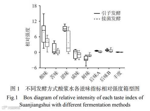 琚湾酸浆面风味特征为酸、香、辣,是湖北省非物质文化遗产和中国地理标识产品,其酸味及主体香味主要来源于酸浆水,因此,酸浆水口感、风味等发酵特征对成品酸浆面品质有着重要的影响。本研究首先使用电子舌对15份发酵乳杆菌单菌发酵酸浆水及15份老卤水引子发酵酸浆水的滋味特征进行了测定,两类样本的8个滋味指标测定结果见图1。