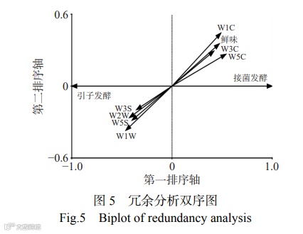 由图5可知,W3S、W2W、W5S、W1W、W1C、W5C、W3C和鲜味与RDA排序约束轴上的酸浆水样品具有良好的赋值相关,即上述8个指标代表了不同发酵方式制作酸浆水品质总体结构差异显著相关的关键指标。W3S、W2W、W5S和W1W位于引子发酵一侧,说明这4个指标在加引子发酵的酸浆水中强度高于乳酸菌纯种发酵;而鲜味、W1C、W3C和W5C则呈现出相反的趋势。结合2.1中结果可知,W3S、W1C、鲜味、W3C和W5C在两者中存在显著性差异(P<0.05),而W2W和W5S差异不显著(P>0.05)。由此可见,发酵乳杆菌纯种发酵制作的酸浆水中芳香类物质含量较高、烷烃类物质含量较低是导致其与加引子发酵方式制作的酸浆水品质差异的主要原因。