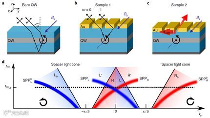 磁光效应(Magneto-opticalphenomena),如法拉第(Faraday)和克尔效应(Kerr effect),在控制介质中传播的光场偏振和强度方面起着重要作用。其中,光的出射方向对外部磁场的取向有着一定的依赖关系,被称为强度效应(intensityeffect),因其可以用于光的路由控制,因而引起了人们极大的研究兴趣。到目前为止,已知利用强度效应来控制光发射的应用都是沿着平行于磁场的轴线方向。近日,来自德国多特蒙德工业大学、俄罗斯科学院Ioffe研究所、波兰科学院的研究团队报道了一类新的光发射现象,即位于表面附近的光源方向垂直于外部磁场的施加方向,他们称之为光发射的横向磁性路由(transversemagnetic routing)。作为这种效应的原理性证明,研究人员在稀磁半导体量子阱中(diluted-magnetic-semiconductorquantum well)展示了激子(exciton)发射的路由现象,并且在等离子体-半导体的杂化结构中观测到对方向性的增强效率高达60%。相关研究发表在近期的《Nature Physics》上。