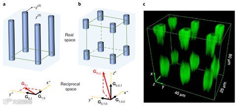 以光学倍频为代表的光学非线性技术在激光波长扩展、超快信号处理、量子光源和太赫兹技术等方面具有重要的应用。而要实现高效率的光学频率转换,非线性晶体中的光波就必须要满足相位匹配(Phase Matching)条件,即转换前后同时满足动量和能量守恒。在传统的均匀晶体中,相位匹配条件是很难满足的;近年来,人们在具有周期性结构的光子晶体(photoniccrystal)中提出了准相位匹配(Quasi-Phase Matching,QPM)的概念,实现了在均匀晶体中难以获取的非线性特性和功能,确保了不同频率的光波之间的高效能量交换。然而,到目前为止,由于缺乏三维样品的制备技术,非线性光子晶体只能被限制为一维或二维的几何形状,如常见的超晶格结构。近日,来自澳大利亚国立大学的WieslawKrolikowski教授、Yan Sheng博士等人,以及山东大学的王继扬教授、张怀金教授研究团队、波兰华沙工业大学KrzysztofSwitkowski教授、德国马普所Kaloian Koynov教授等人,通过采用超快光学局域反转(ultrafastlight domain inversion)的方法,在Ba0.77Ca0.23TiO3(BCT)铁电材料中制备出了一个三维非线性光子晶体,能够沿任意方向对非线性过程进行相位匹配,消除了低维体系在空间自由度上受到的约束。此处所使用的光学极化方法与现有的光学制备技术完全兼容,包括常见的飞秒激光直写折射率分布,可拓展到铌酸锂(lithium niobate)等优异的非线性光电材料,为实现下一代光通信的三维非线性集成光子器件的芯片制造技术铺平了道路。相关论文发表在近期的《Nature Photonics》上。