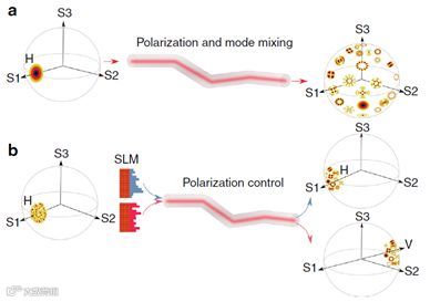 多模光纤(Multimodeoptical fibers)在通信、成像、高功率激光器和放大器中的应用越来越广泛。然而,光纤中的内在缺陷和环境扰动将会引起随机偏振和模式混合,导致输出光的偏振特性不同于输入时的偏振状态;这种差异对于偏振敏感的技术应用,如控制光纤探针远端的光-物质相互作用或非线性光学过程是一个十分严重的问题,实际应用中往往需要借助成本较高的单模、保偏光纤。最近,来自美国耶鲁大学的Hui Cao教授课题组领衔的科研团队仅仅通过操控激光束入射光纤的空间波前,就实现了对多模光纤中所有输出通道的偏振态的完全控制。在这里,研究人员通过波前整形技术(wavefrontshaping)在各个输出通道上产生了任意的偏振态,而不需要对输入光的偏振特性加以限制。在多模光纤中,空间模式和偏振自由度之间的强耦合能够使得在仅具有空间自由度的前提下,实现对光学模式的全偏振控制。因此,此处所采用的波前整形技术能够将多模光纤转换为波片的高效、可重构矩阵(reconfigurablematrix of waveplate),可应用于成像和通信等方面。相关研究发表在近期的《Light: Science& Applications》上。