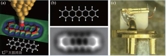 图5 (a)基于qPlus 型AFM技术的探针实现分子化学结构成像的原理图;(b)并五苯分子的化学结构模型与对应的AFM图像;(c)国家纳米科学中心研制的qPlus 型原子力传感器的光学显微镜照片