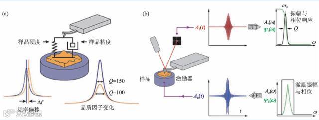 图6 (a)AFM探针—样品接触的Kelvin—Voigt力学模型;(b)频带激励模式的原理示意图