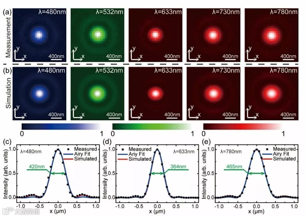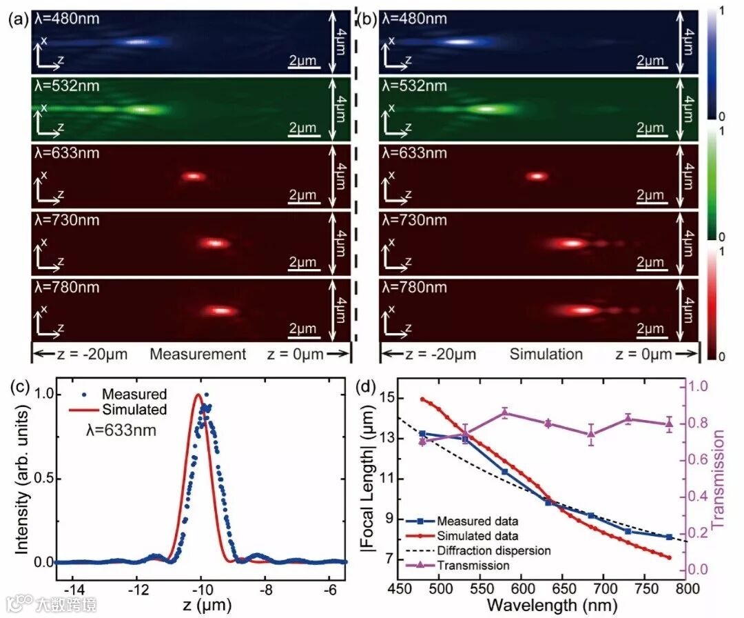 (a,b) 不同波长下超透镜虚焦点xz平面上的强度分布实验和数值结果;