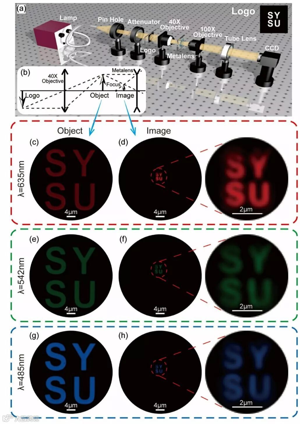 (c-h) 不同波长下微超透镜的成像结果,(c,e,g)为物体,(d,f,h)为对应的像。