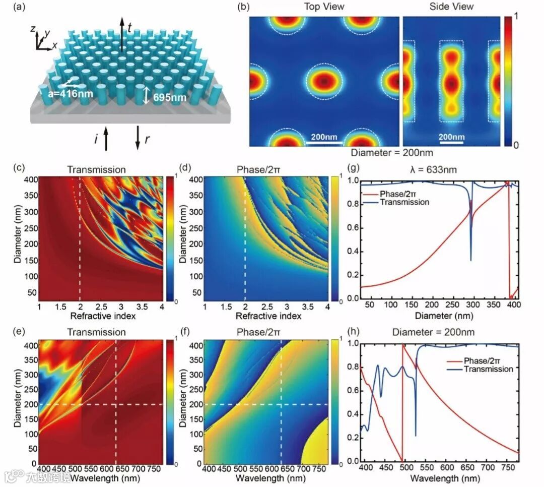 (c,d,g) 入射光波长为633nm下不同折射率和柱子直径的光栅透过率和相位响应;