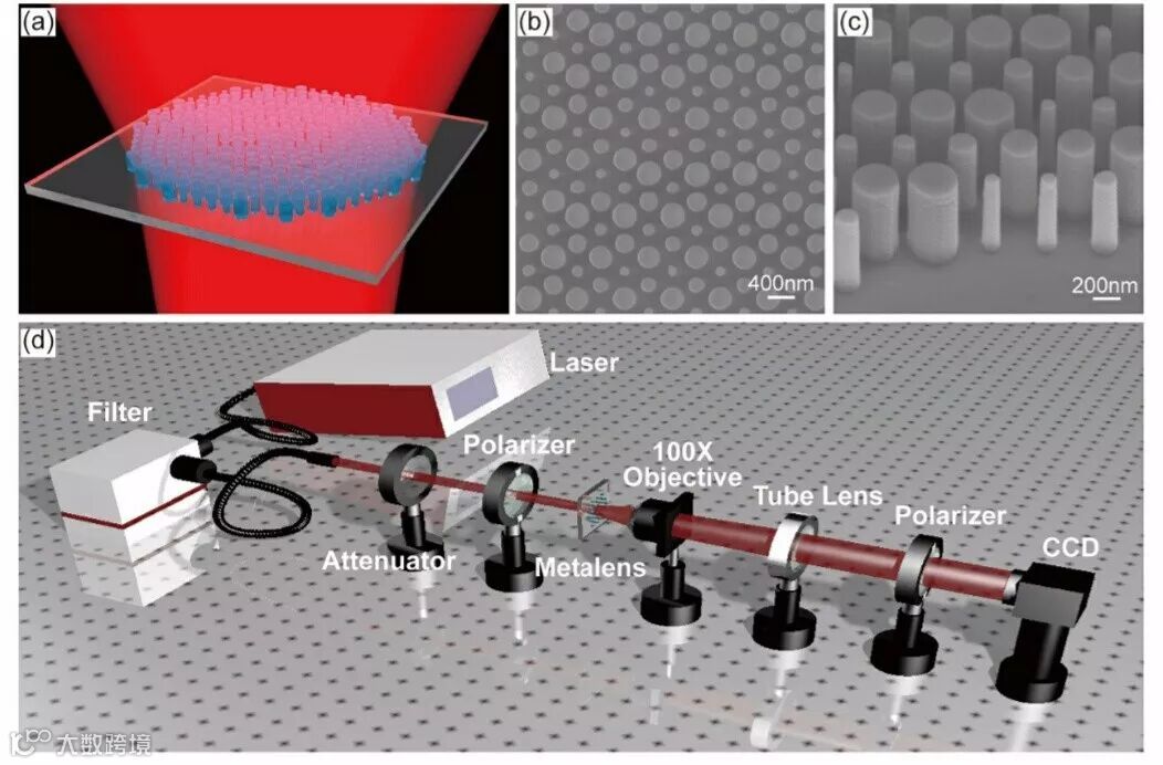 (d) 超透镜实验测量表征光路图。