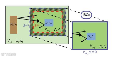 沉浸式边界条件方法中引入的物理(右)和全域(左)的示意图,其中声学介质参数ρ为质量密度、c为波的传播速度。