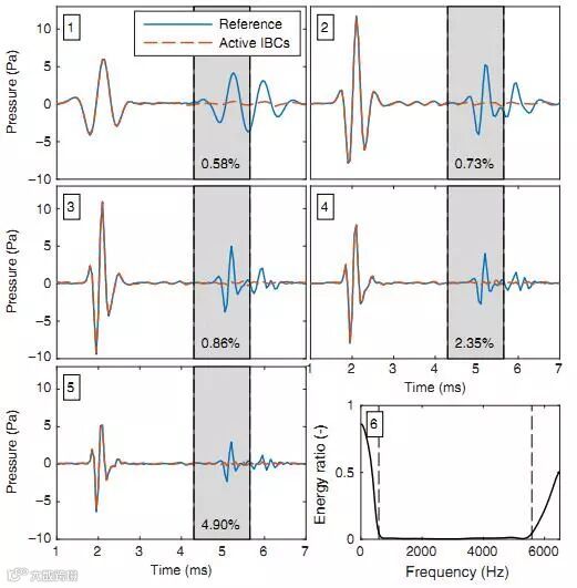 图(1-5)显示了对于发射的Ricker小波,在x1rec处的压力记录,其中心频率为1~5kHz。图(6)式相对于参考能量作为频率的函数,在所有五个实验中的求和。