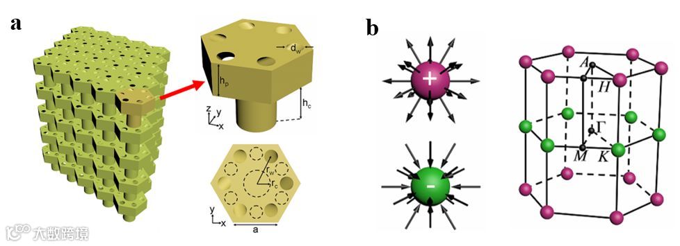 图1:a 外尔声子晶体结构示意图,通过倾斜的波导实现了层间的手性耦合; b 三维布里渊区内的外尔点的分布,两种颜色代表不同的手性的外尔点。