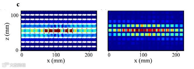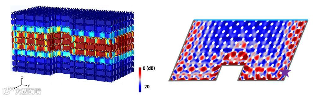 图5:表面态自准直效应的场分布模拟图,可以看到点源激发的声场沿着一个方向传播,并且能够绕过拐角。